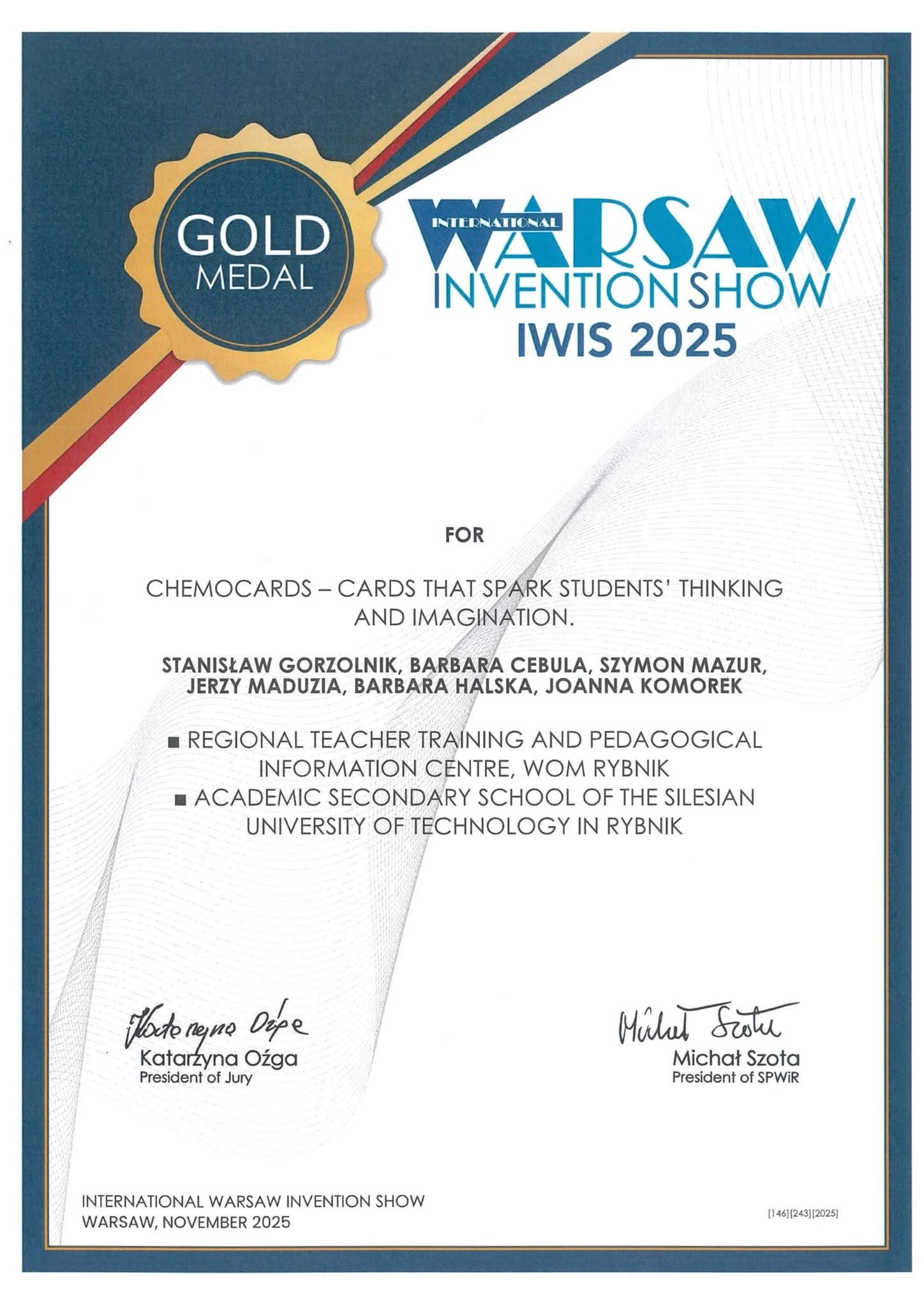 Miło nam poinformować, że nasza nauczycielka p. Joanna Komorek jest jedną ze współautorek innowacyjnego projektu edukacujno-metodycznego CHEMOCARDS, który zdobył złoty medal w konkursie International Warsaw Invention Show IWIS. Jednocześnie dziękujemy RODN "WOM" w Rybniku za współpracę.