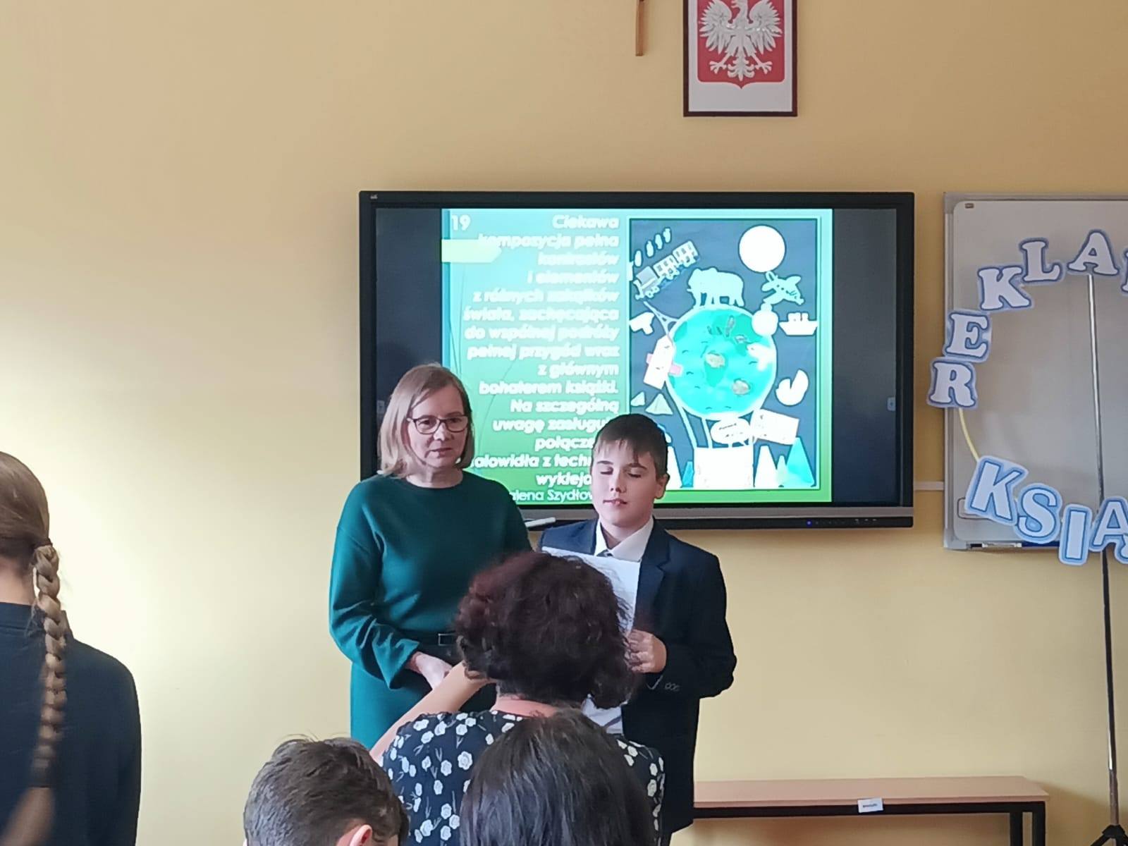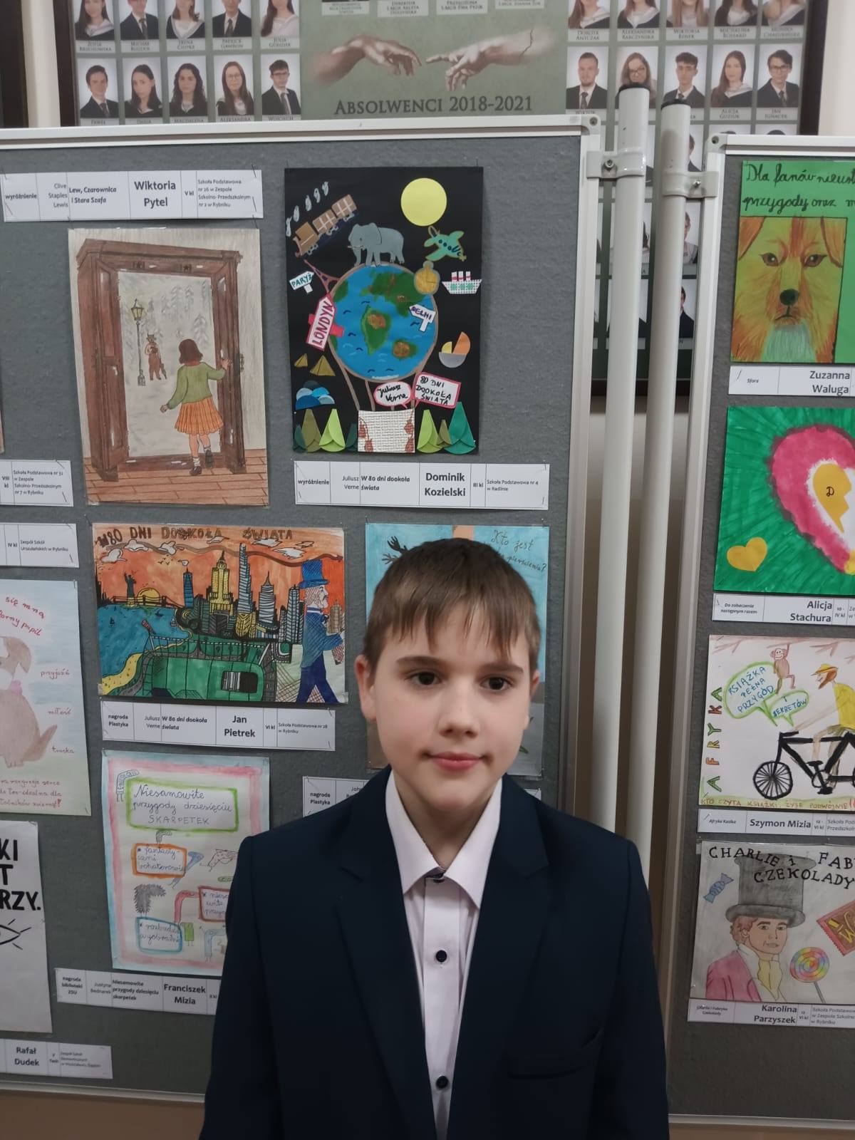 Uczeń klasy III b, Dominik Kozielski, został laureatem Regionalnego Konkursu Plastycznego „Reklama ulubionej książki”. ??