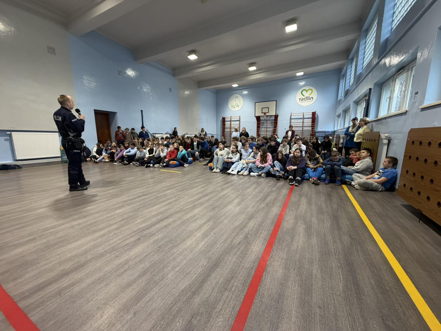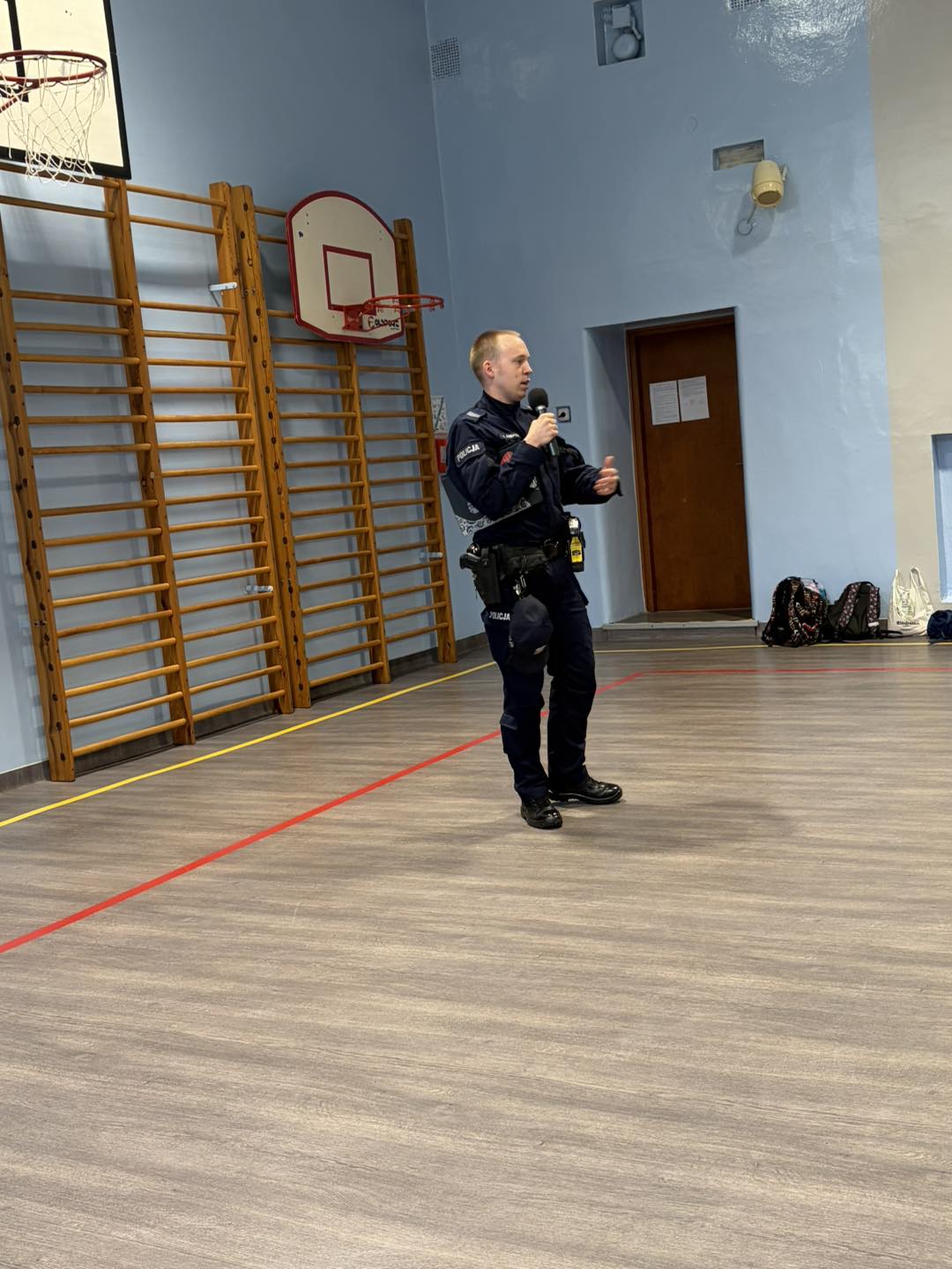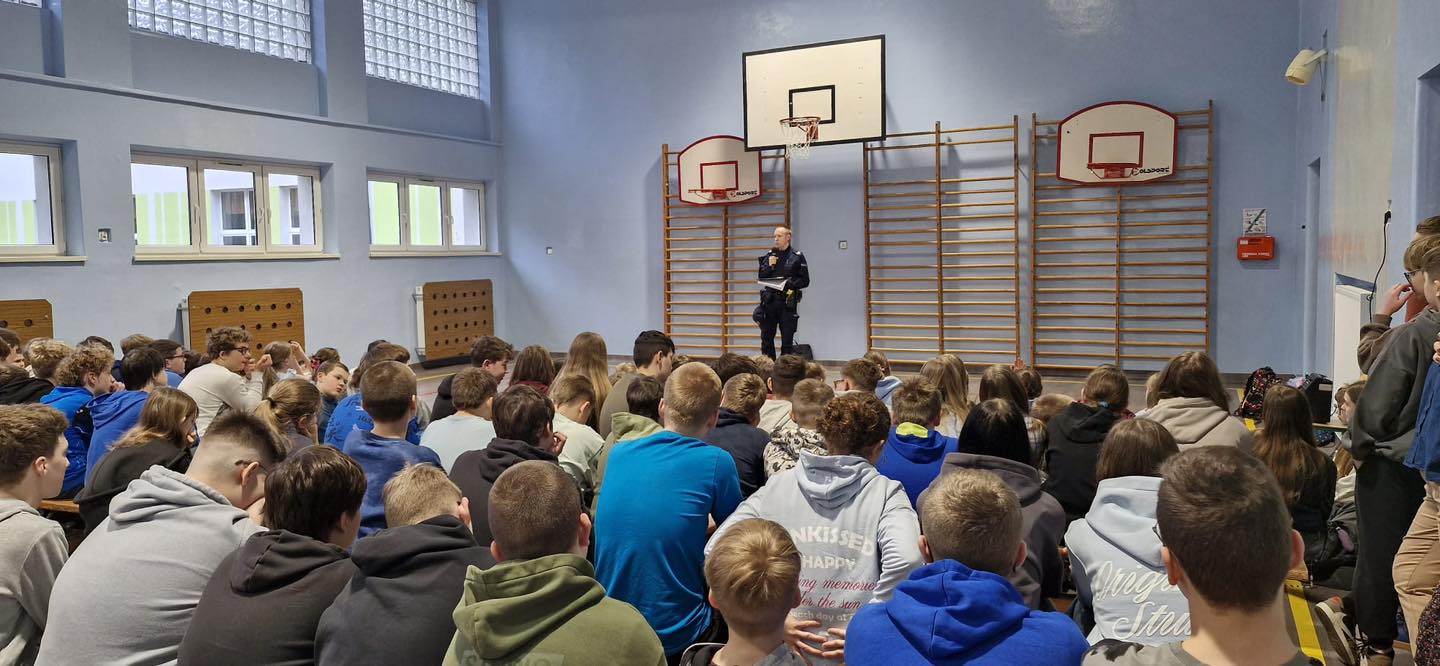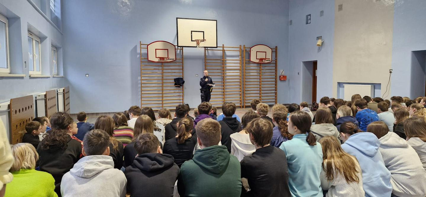 Uczniowie klas 4-8 spotkali się dziś z dzielnicowym, który przeprowadził pogadankę na temat konsekwencji przestępstw wśród nieletnich.