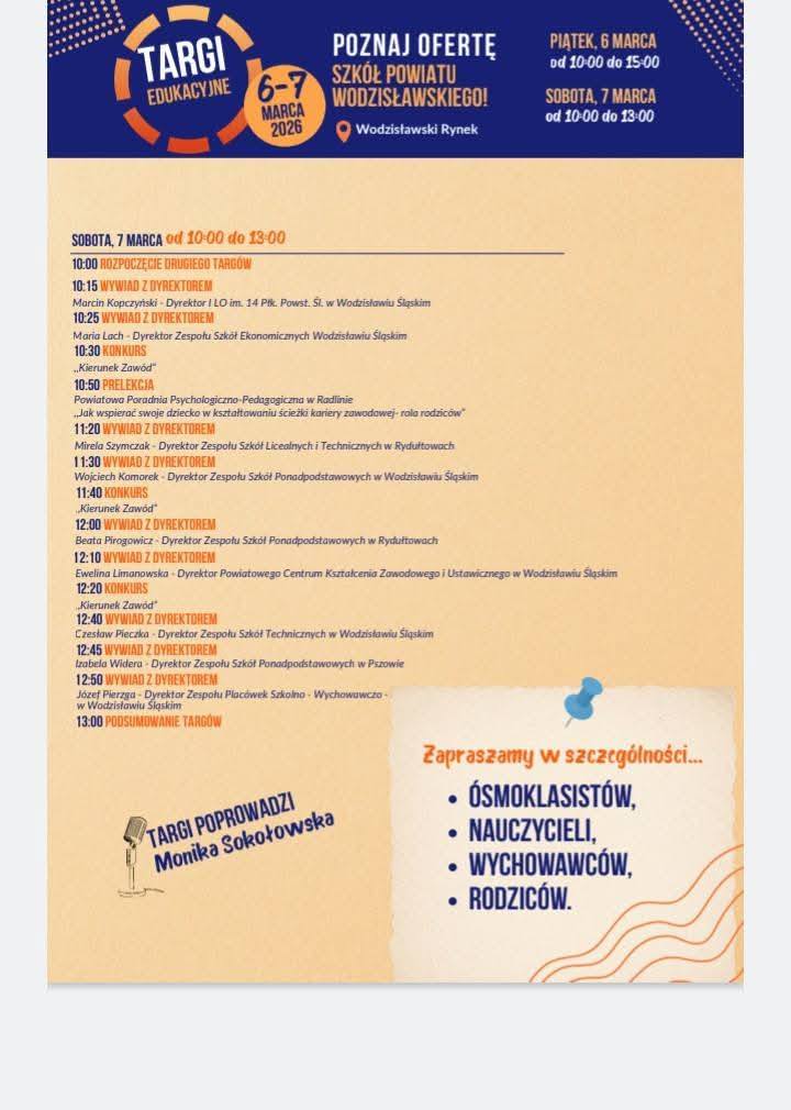 Zapraszamy na TARGI EDUKACYJNE do Wodzisławia Śląskiego w dniach 6-7 marca 2026 r. Szczegóły na plakatach