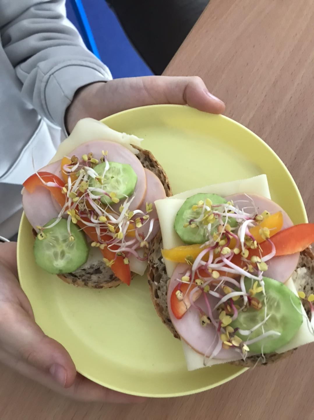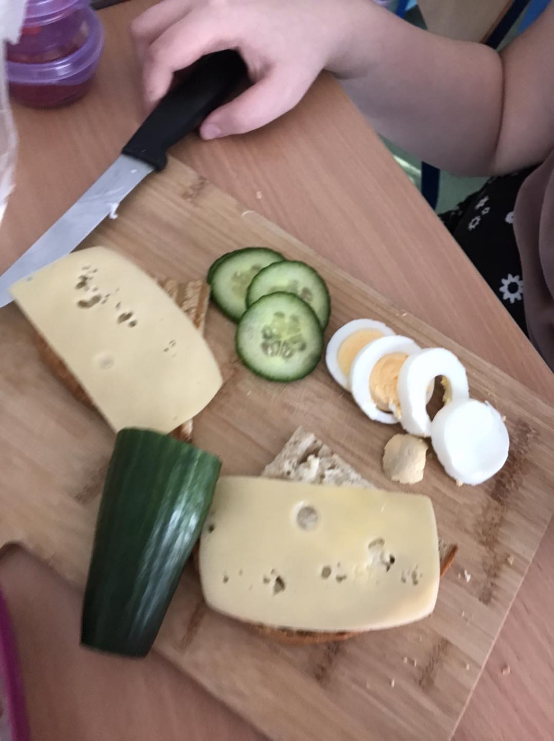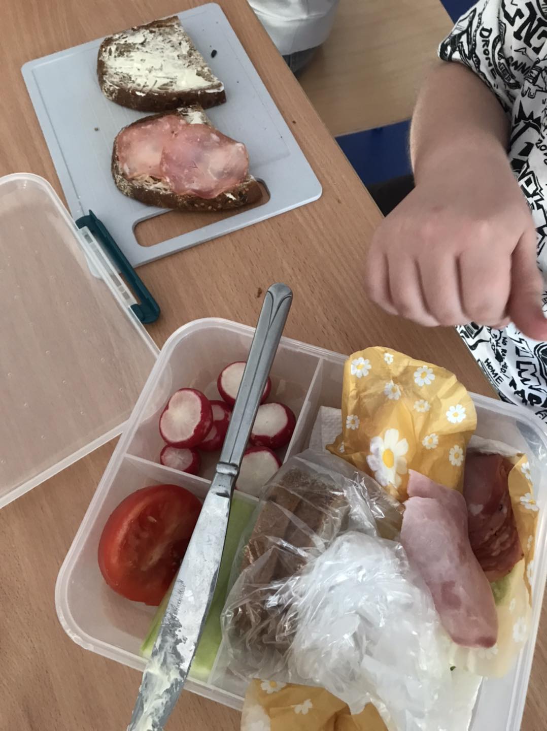Najpierw prezentacja o zdrowym odżywianiu, interaktywne zadania, a później przygotowywanie i pałaszowanie pysznych, kolorowych, pachnących kanapeczek. Mniam!